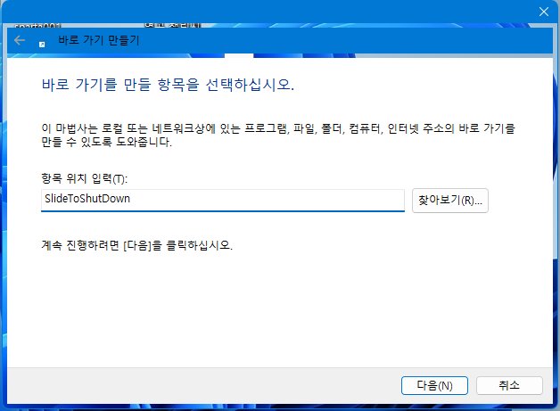 002 창이 뜨면 SlideToShutDown을 입력하고 다음을 누르면 아이콘이 생긴다.