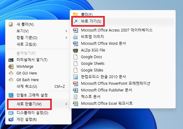 001 바탕화면 아무 곳에 우클릭->새로 만들기->바로 가기(s)
